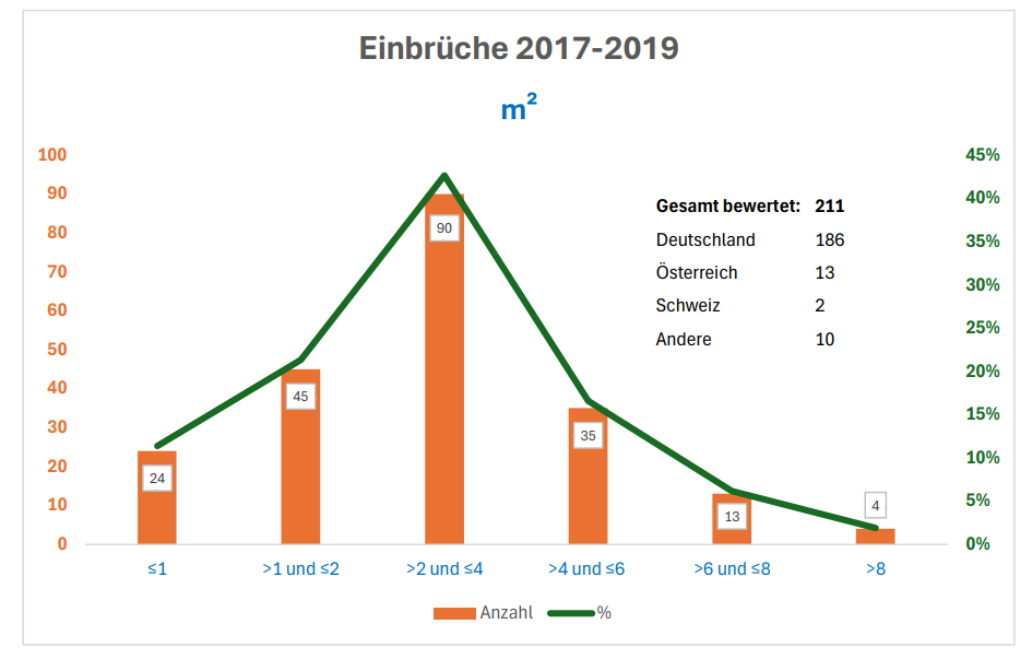 Eine sicherheitsrelevante Herausforderung stellt sich besonders dann, wenn große Glasflächen verbaut werden. Eine interne Erhebung unseres Partners Silatec zeigt, dass Einbrecher in 90 der 211 dokumentierten Fälle zwischen 2017 und 2019 in Deutschland, Österreich und der Schweiz über Fenster oder Türen mit Flächen von 2 bis 4 Quadratmetern in die Gebäude eindrangen. Diese statistischen Daten widerlegen die weit verbreitete Annahme, dass Täter bevorzugt kleinere Öffnungen wählen. Die Nachfrage nach Sicherheitslösungen für große Glasflächen wächst daher kontinuierlich.