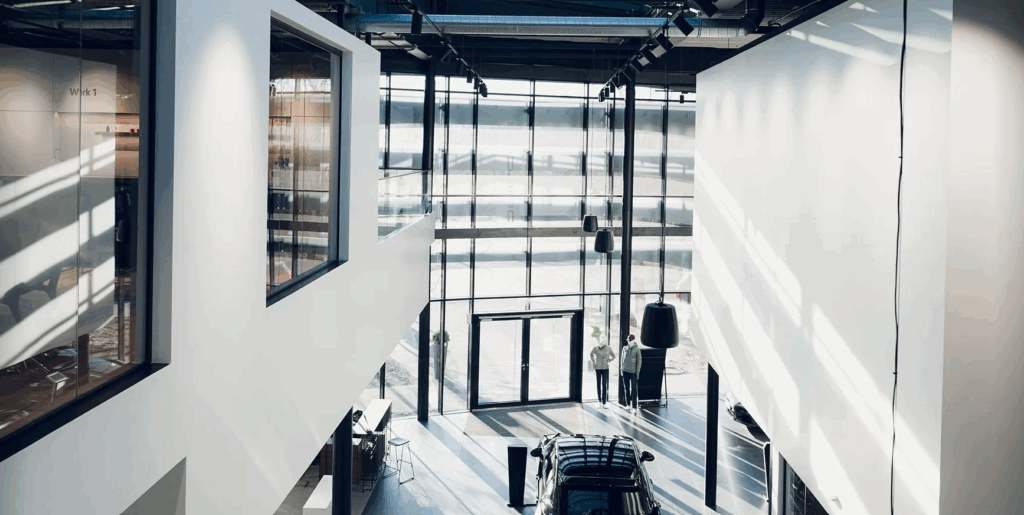 Ein zentrales Element: die neu gestaltete „Sichtschlitz-Fassade“, typisch für das Porsche-CI, mit Glasflächen, Alucobond-Elementen und schwarzem Trapezblech. In den transparenten Fassadenbereichen fiel die Wahl auf eine unsichtbare Innovation: INFRASHADE®, ein adaptives Glas, das sich automatisch dem Sonnenstand anpasst – ganz ohne mechanische Steuerung. Die Wirkung? Maximale Transparenz, perfektes Raumklima, null Ablenkung vom Design.